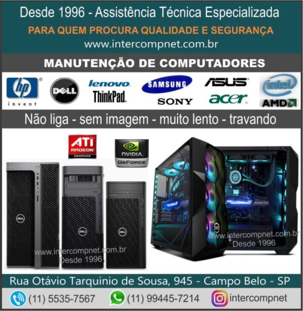 Somos uma assistência técnica especializada em manutenção, conserto, reparos, configuração, formatação e upgrade em computadores de várias marcas e modelos: pc, desktop, torre, workstation, estação gráfica, mini-pc, pdv, computador gamer, pc-gamer, all in one, tudo em um, macintoshi apple, imac, mac pro, imac-pro, imac-air; trabalhamos somente com peças originais de primeira linha, traga seu equipamento para uma avaliação técnica!